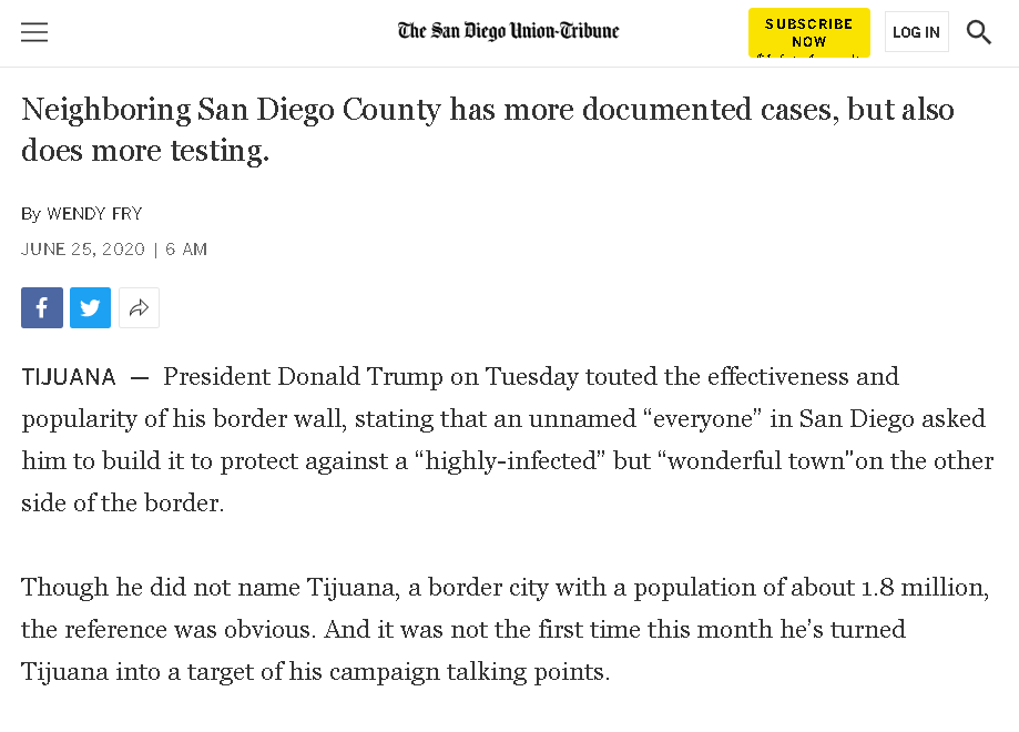 時(shí)間進(jìn)入到6月下旬,雖然上述的措施都已經(jīng)投入實(shí)施,不過(guò)美國(guó)國(guó)內(nèi)的疫情數(shù)字仍在不停上漲,疫情的拐點(diǎn)還遙遙無(wú)期,在這樣的情況下,特朗普就只好繼續(xù)把疫情的鍋甩給墨西哥,把墨西哥與美國(guó)邊境線上最知名的口岸城市蒂華納塑造成病毒的集中區(qū)域,并且稱(chēng)蒂華納已經(jīng)成為“全球范圍內(nèi)病毒的傳播源”。