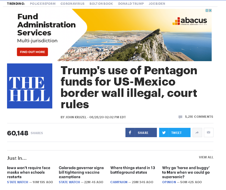 然而根據(jù)報(bào)道,就在美墨邊境墻剛竣工200英里的慶祝儀式剛剛過(guò)去3天,特朗普大贊其阻擋新冠病毒、加固邊境安全的熱度還維持高位的時(shí)候,在6月26日,美國(guó)加州一家聯(lián)邦法院就裁定,特朗普政府挪用五角大樓資金修建美國(guó)與墨西哥間的邊境墻屬于違法行為。