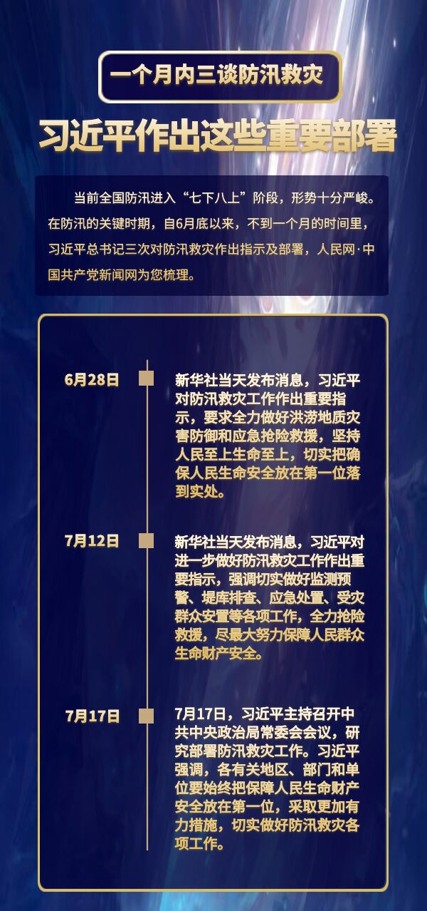在7月17日召開的中共中央政治局常務委員會會議上,習近平強調,各有關地區、部門和單位要始終把保障人民生命財產安全放在第一位,采取更加有力措施,切實做好防汛救災各項工作。