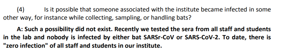 石正麗還表示,已對(duì)其實(shí)驗(yàn)室的所有員工和學(xué)生進(jìn)行了血清檢測(cè),沒有人感染蝙蝠SARSr-CoV 或新冠病毒,并稱迄今為止武漢病毒所的所有員工和學(xué)生都是“零感染”。↓