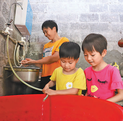 5月28日,譚鳳金的女兒(中)在家里接水。