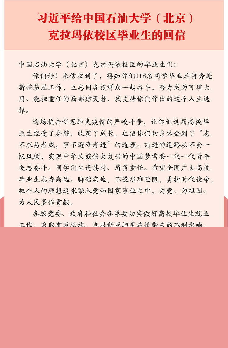 7月7日,在給中國石油大學(北京)克拉瑪依校區畢業生的回信中,習近平強調,各級黨委、政府和社會各界要切實做好高校畢業生就業工作,采取有效措施,千方百計幫助高校畢業生就業。
