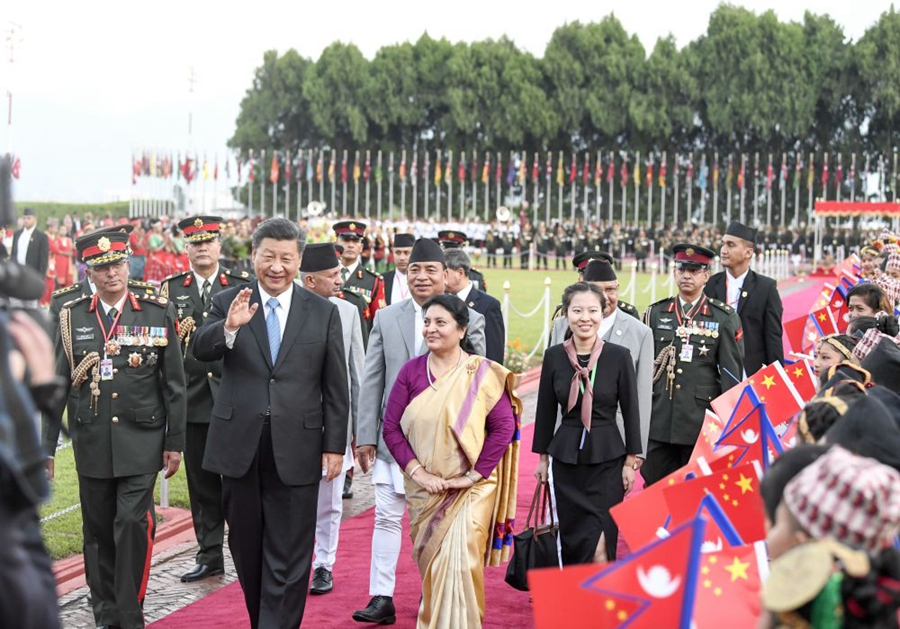 2019年10月12日,國(guó)家主席習(xí)近平乘專機(jī)抵達(dá)加德滿都,開始對(duì)尼泊爾進(jìn)行國(guó)事訪問(wèn)。尼泊爾總統(tǒng)班達(dá)里在機(jī)場(chǎng)為習(xí)近平舉行具有濃郁尼泊爾民族特色的歡迎儀式。新華社記者 高潔 攝