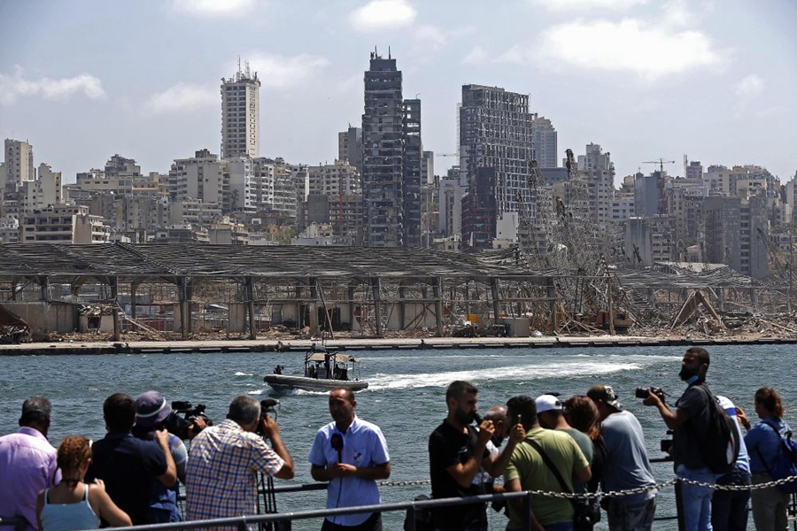 2020年8月8日,媒體記者在被炸毀的黎巴嫩貝魯特港口區(qū)采訪。貝魯特港口區(qū)4日傍晚發(fā)生劇烈爆炸,迄今爆炸已造成158人死亡、6000多人受傷,另有數(shù)十人下落不明。爆炸還造成約30萬(wàn)民眾無(wú)家可歸。 新華社發(fā)(比拉爾·賈維希 攝)
