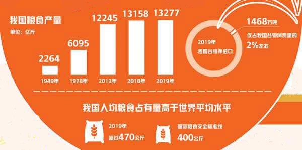 程國強(qiáng):解決好吃飯問題,是中國人千百年來夢寐以求的目標(biāo)。新中國成立后特別是改革開放以來,在中國共產(chǎn)黨的領(lǐng)導(dǎo)下,我國經(jīng)過艱苦奮斗和不懈努力,在農(nóng)業(yè)基礎(chǔ)十分薄弱、資源條件極其有限的基礎(chǔ)上,依靠自身力量,實現(xiàn)了由“吃不飽”向“吃得飽”,進(jìn)而追求“吃得好”的歷史性轉(zhuǎn)變。這既是世界糧食安全的巨大成就,也是全球農(nóng)業(yè)的歷史奇跡。統(tǒng)計數(shù)據(jù)顯示,1949年,我國糧食產(chǎn)量只有1.1318億噸左右,人均糧食占有量只有209公斤;2019年,我國糧食產(chǎn)量已經(jīng)連續(xù)多年突破6.5億噸,人均糧食占有量上升至470公斤,比新中國成立時的209公斤增長了126%,高于世界平均水平。目前,我國谷物自給率超過95%,水稻和小麥兩大口糧自給率超過100%,中國人已經(jīng)將“飯碗”牢牢端在了自己手上。