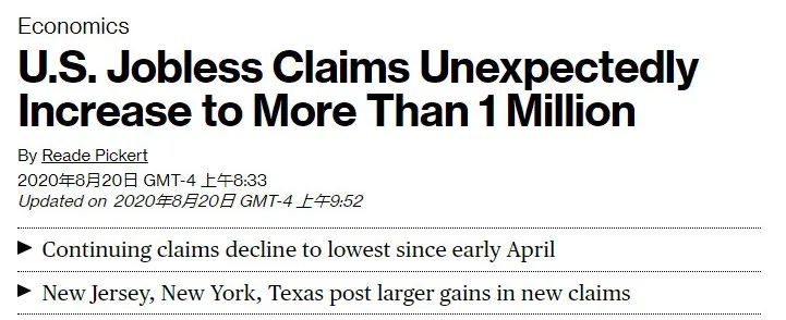 美國勞工部發布的數據則顯示,截至8月15日的一周,美國首次申請失業救濟人數再度突破100萬關口。美國就業市場復蘇依然步履蹣跚。
