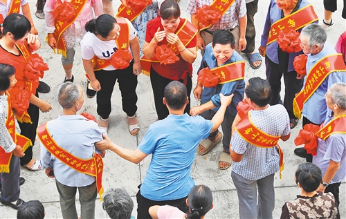▲陜西省漢中市洋縣龍亭鎮柳山村一組建檔立卡貧困戶周崇華(中后右二)在黨員干部的幫扶下,勤勞創業,發家致富,被評為“脫貧民星”,在表彰會現場,村民你拉我拽爭著和他合影。近年來,該村定期在全村開展脫貧民星、文明家庭、致富帶頭人等各類先進典型評選表彰,激勵廣大村民奮發有為,增收致富,爭先創優。