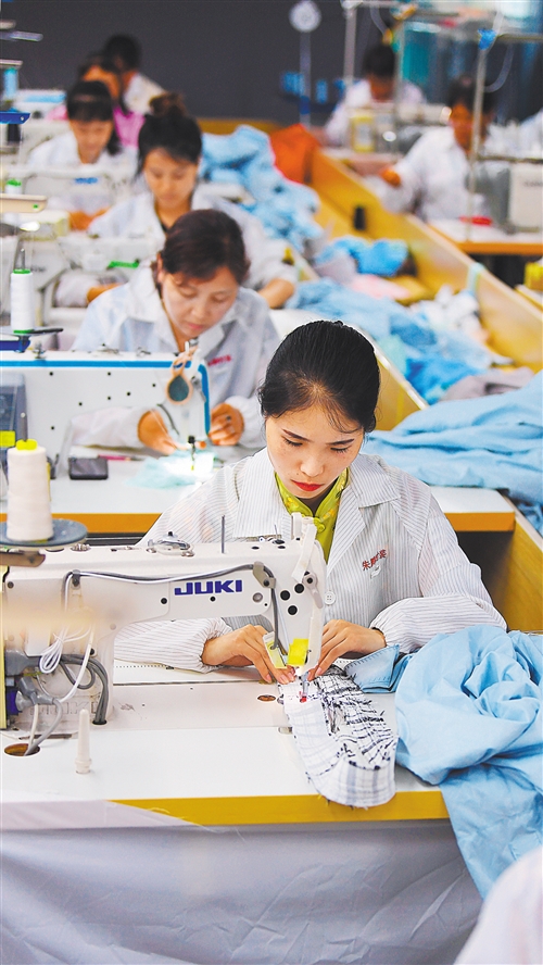 ▼洋縣朱鹮時裝工廠來自柳山村一組的貧困戶周錦(中前一)正忙著加工服裝。她在該企業上班年收入2萬多元,實現就業增收。