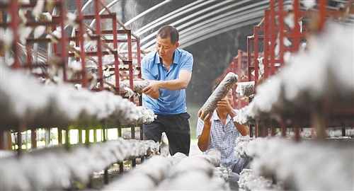 柳山村黨支部書記劉富民在村扶貧互助合作社整理冬菇菌袋。該村扶貧互助合作社成立2年多來,帶動了93戶村民穩定增收。
