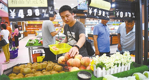 洋縣蔚藍超市,顧客正在選購柳山村供應的果蔬。目前,該村共種植油桃、獼猴桃1500多畝,年產值300多萬元。