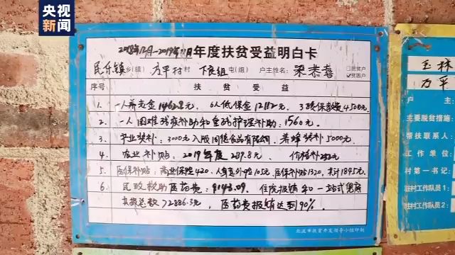 三年間,提高報銷比例、下調(diào)藥品價格。每一項醫(yī)療扶貧政策,究竟從梁恭喜肩上頭卸下多少擔子?我們在梁恭喜家墻上的扶貧收益明白卡里尋找答案。