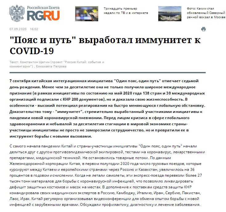 當地時間9月7日,《俄羅斯報》網站在《中俄銳評》專欄刊發題為《“一帶一路”賦能全球抗疫》的評論文章。文章稱,9月7日適逢中國提出“一帶一路”倡議七周年。7年來,該倡議得到138個國家和30個國際組織的支持與信任,在應對全球挑戰方面展示出強大生命力。面對新冠肺炎疫情導致的全球公共衛生危機以及世界經濟蕭條這一前所未有的局面,“一帶一路”沿線國家不僅繼續保持框架內的經濟和項目合作,還特別加強抗疫協作,共同應對全球挑戰。