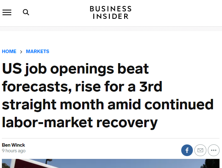 △《商業(yè)內(nèi)幕》稱(chēng),在勞動(dòng)力市場(chǎng)持續(xù)復(fù)蘇的情況下,美國(guó)空缺職位連續(xù)3個(gè)月增加