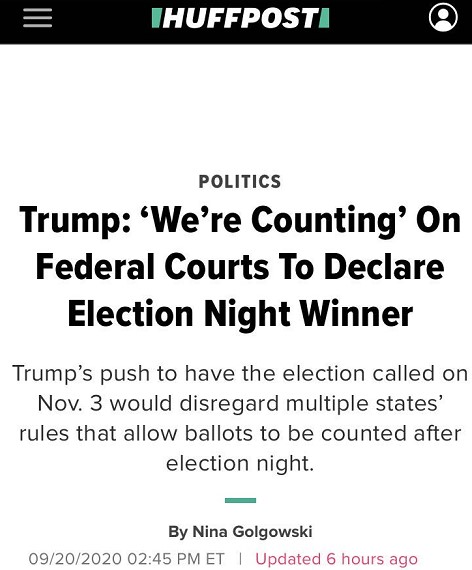 特朗普最近一次表態透露了他對聯邦最高法院的“信任”。9月19日在北卡羅來納舉行的競選集會上,特朗普稱,相信聯邦法院會保證計票結果在大選結束后數小時內就予以公布,而“不需要在選舉一周或兩周后還在統計選票”。 眾議員唐·拜爾認為,“這是特朗普公開承認希望利用最高法院竊取選舉勝利”,如此言論是赤裸裸地“利用聯邦法院舞弊,否認民眾依法郵寄選票的權利”。