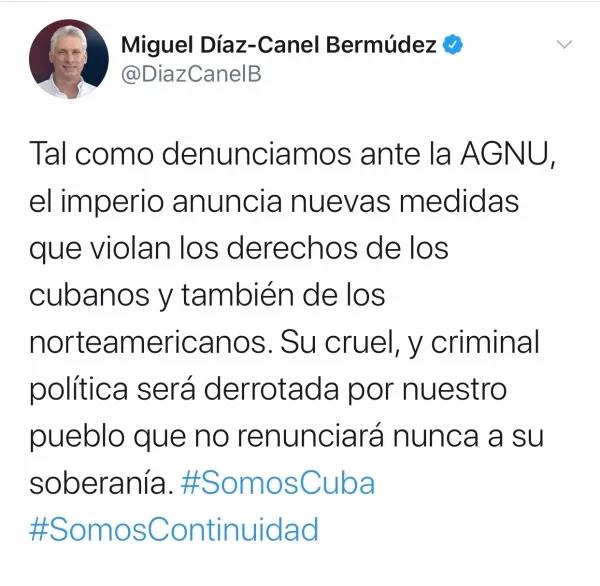 對此,古巴國家主席迪亞斯-卡內爾在社交網站上發文指出,美國宣布的新制裁措施侵犯了古巴公民和美國公民的權利,這項殘酷政策將被古巴人民“粉碎”,古巴永遠不會“放棄自己的主權”。