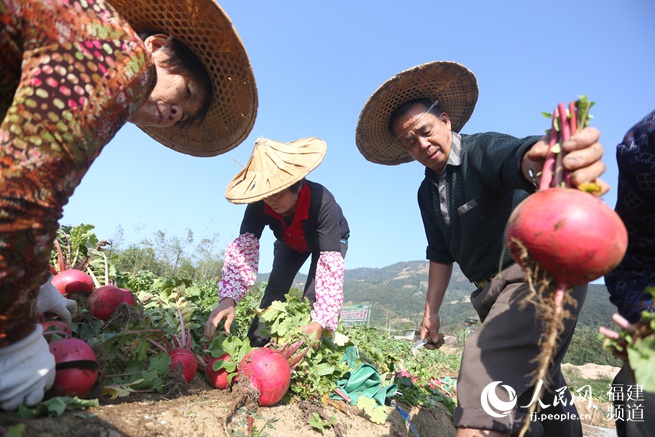 基地不僅種了本地的大白蘿卜,還結合觀光旅游,引進櫻桃蘿卜、美人心蘿卜等新品種。2019年11月底,黃棗村還舉辦了華安縣第一屆多彩蘿卜節。集生產加工、旅游觀光、自助采摘于一體的蘿卜扶貧產業基地吸引了不少游客前來,效益初步顯現。