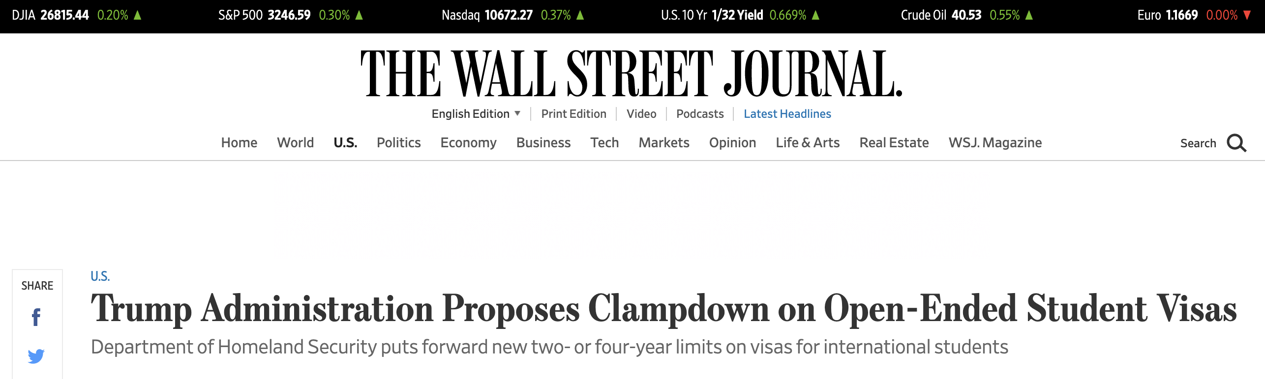 《華爾街日報》報道稱,今年,由于美國政府的移民政策和因新冠疫情而采取的旅行限制,許多學校的留學生入學人數都出現了下降。