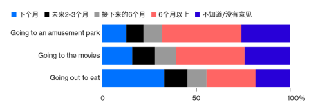 (民調:美國民眾對“何時開始去主題公園、看電影和外出吃飯”做出的選擇 圖自彭博社)