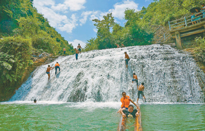 游客在鳳凰縣菖蒲塘村飛水谷景區瀑布游玩。攝于2014年8月。