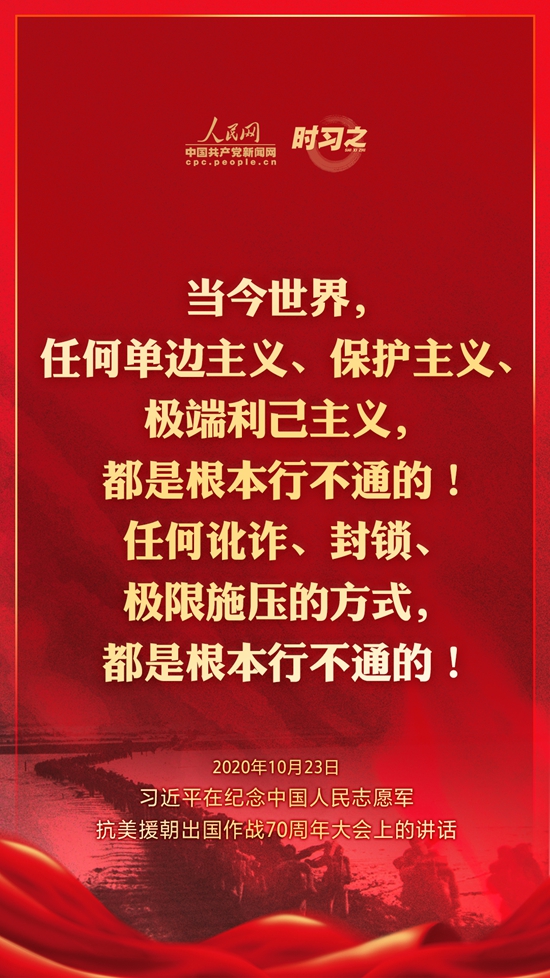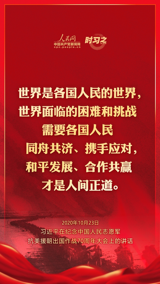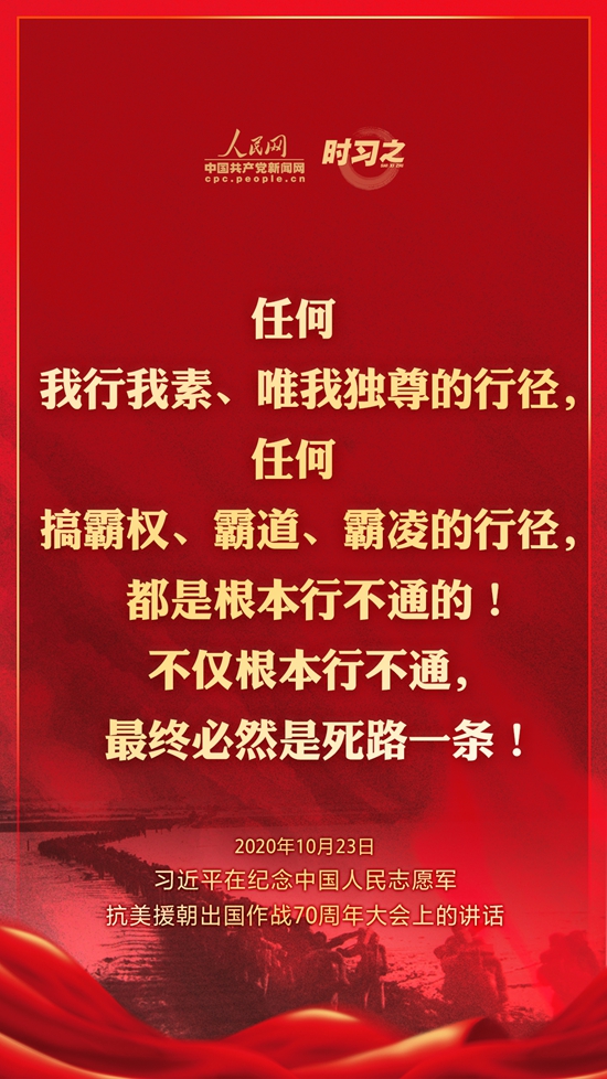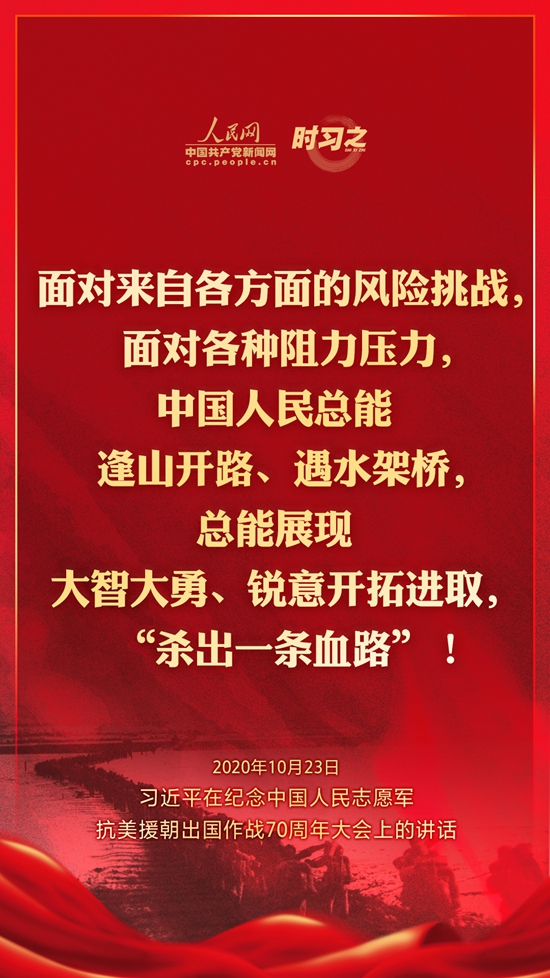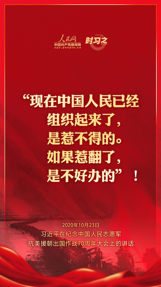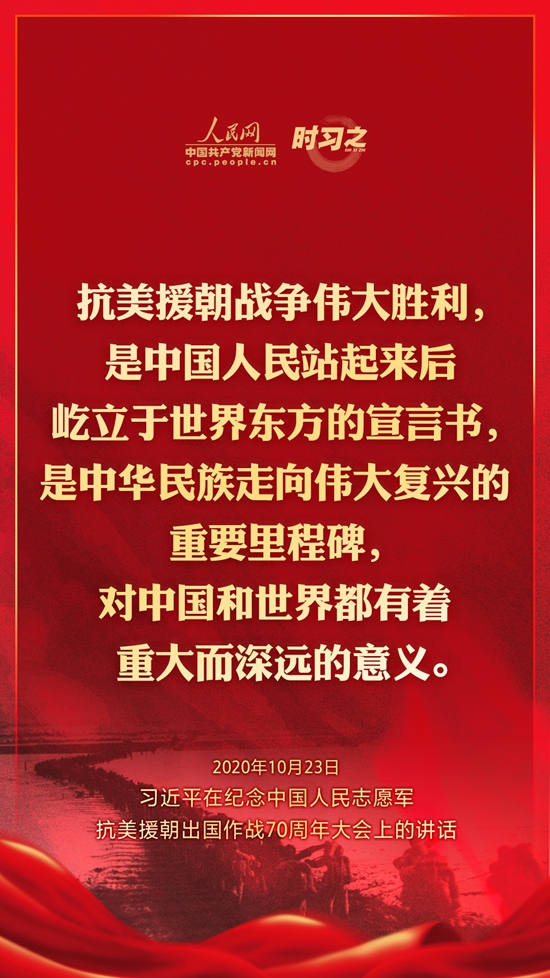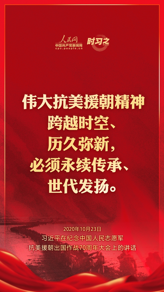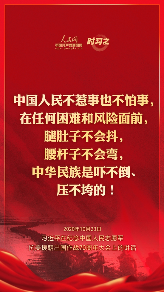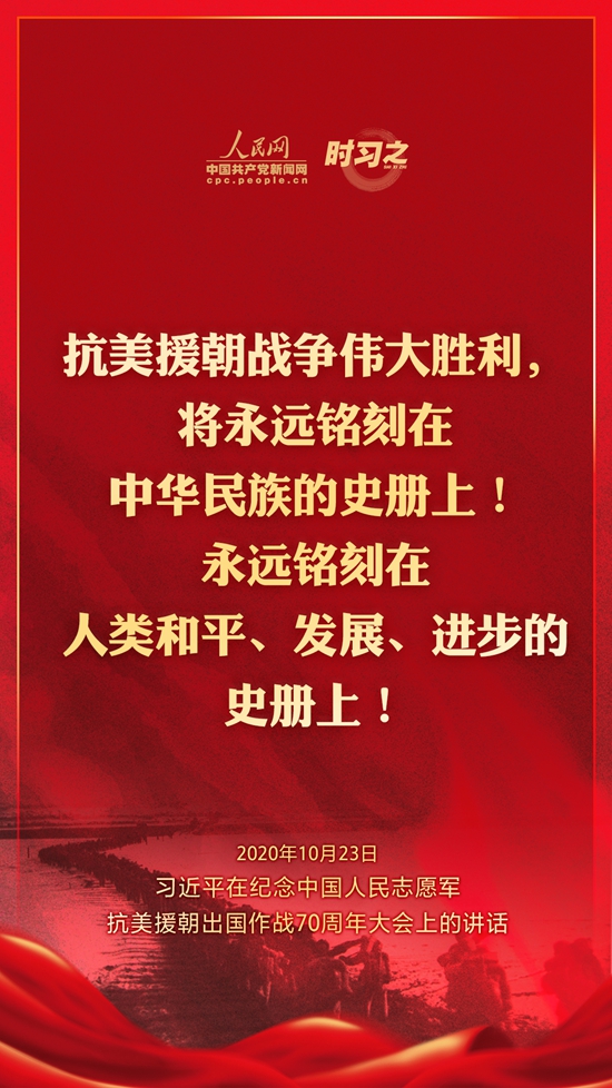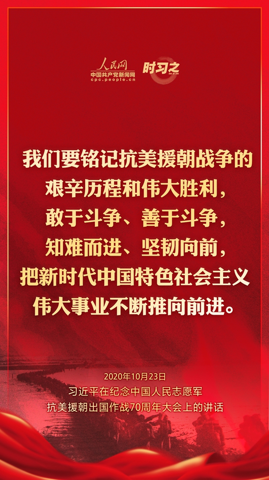 10月23日上午10時,紀念中國人民志愿軍抗美援朝出國作戰70周年大會在北京人民大會堂隆重舉行。中共中央總書記、國家主席、中央軍委主席習近平出席大會并發表重要講話。在講話中,習近平總書記全面回顧總結了抗美援朝戰爭的偉大勝利和巨大貢獻,深刻闡述了抗美援朝精神的歷史意義和時代價值,精辟揭示了抗美援朝戰爭的歷史啟示,鄭重宣示了捍衛國家領土主權和統一、維護地區和世界和平穩定、推動構建人類命運共同體的堅定立場和決心,強調要銘記偉大勝利,敢于斗爭、善于斗爭,把中國特色社會主義偉大事業不斷推向前進。人民網·中國共產黨新聞網“時習之”欄目制作了12張海報,帶您一起回顧總書記鏗鏘有力的話語。