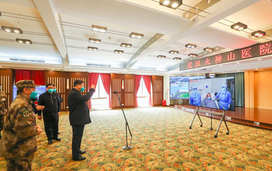 △3月10日,習近平在武漢火神山醫院指揮中心,視頻連線81歲的老年患者。