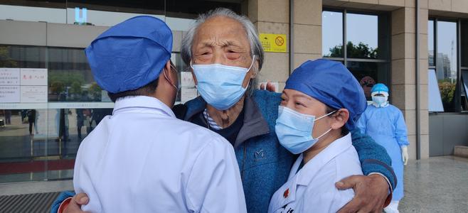 △4月9日,王欣老人痊愈出院,與醫護人員深情相擁。