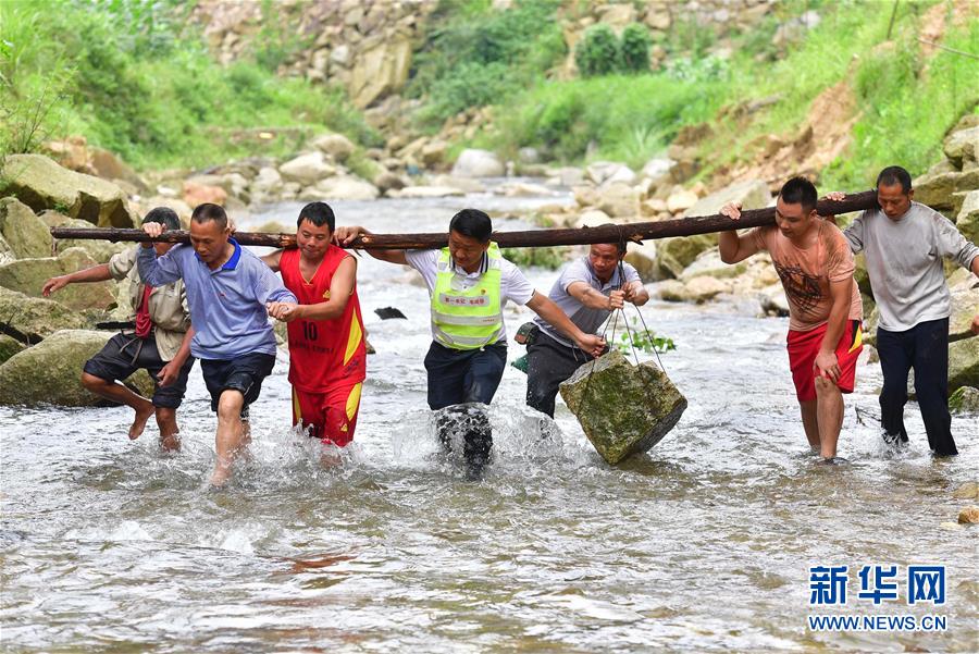 在位于黔桂交界大苗山深處的烏英苗寨,駐村第一書記韋桂華(右四)、黨員梁成兵(右三)、梁志新(左二)帶領村民維修河堤(2019年6月30日攝)。 新華社記者 黃孝邦 攝