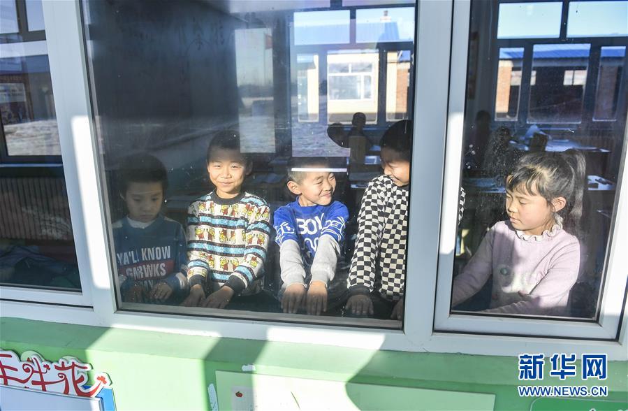吉林省德惠市邊崗鄉臥虎村小學學生在戶外活動后圍著教室內的環流散熱器取暖(2018年12月26日攝)。 新華社記者 許暢 攝