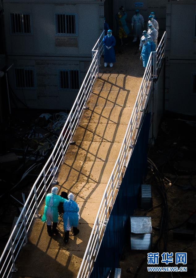 醫護人員將患者送入武漢火神山醫院病房(2020年2月4日攝,無人機照片)。 新華社記者 肖藝九 攝