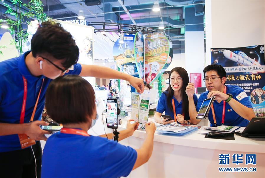 在2020年中國國際服務貿易交易會旅游服務專題展區,中國旅游集團展位的工作人員通過直播向線上觀眾介紹旅游服務產品(2020年9月5日攝)。 新華社記者 潘思危 攝