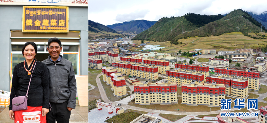 2020年9月22日拍攝的拼版照片:左圖為西藏自治區昌都市類烏齊縣長毛嶺鄉達雄村村民俄金(右)和妻子阿丁在安置點俄金蔬菜店前;右圖為類烏齊縣桑多扶貧開發區易地扶貧搬遷安置點一角(無人機照片)。 新華社記者 詹彥 攝