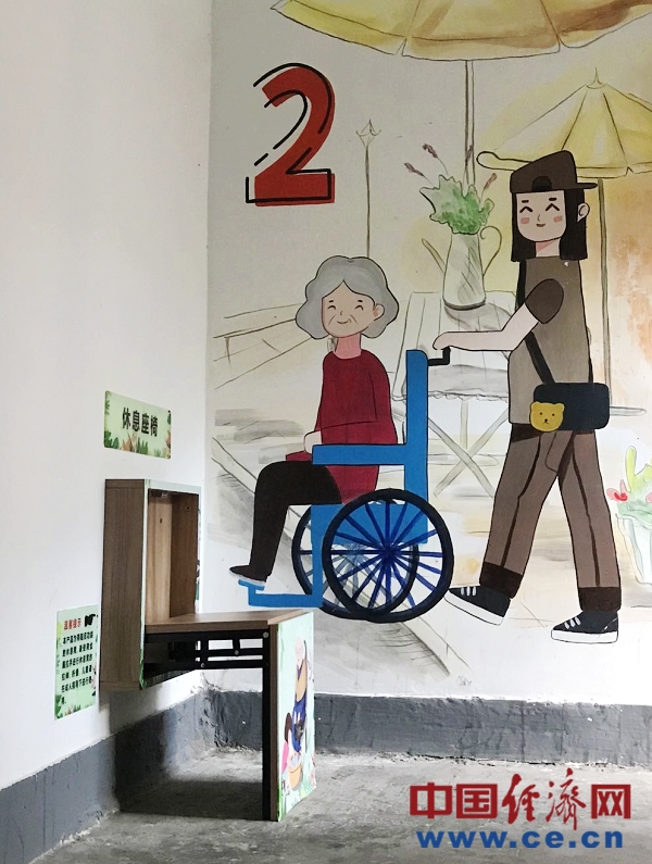 樓道里除了精美的手繪墻,還有增添的樓梯扶手,每層樓都放置的休息座椅……無處不體現了微治理的精巧。