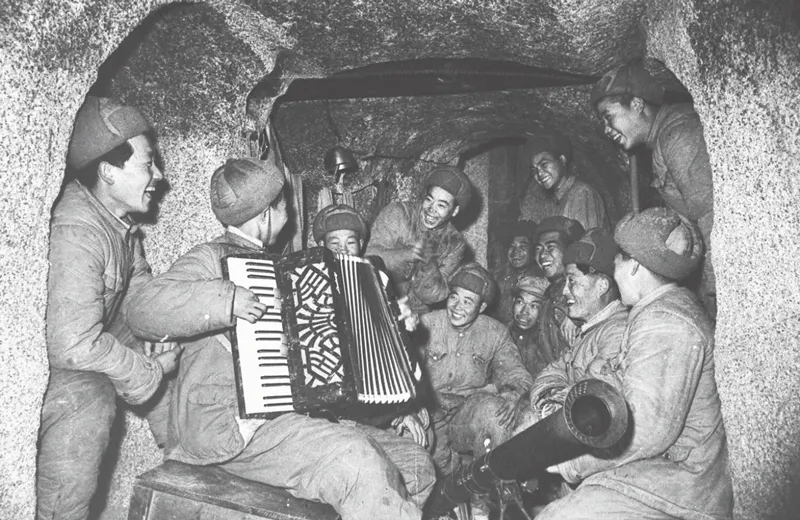 在朝鮮前線,雖然戰斗激烈,生活艱苦,但中國人民志愿軍戰士始終保持著革命樂觀主義精神。圖為戰斗間隙,志愿軍戰士歌聲、笑聲不斷。新華社發 葛力群/攝