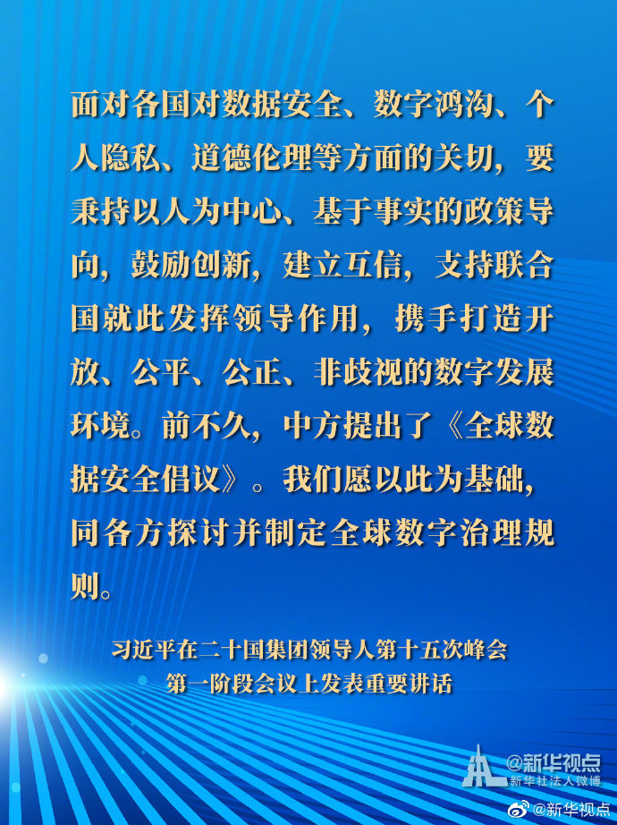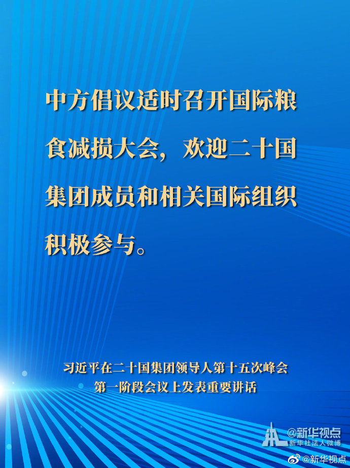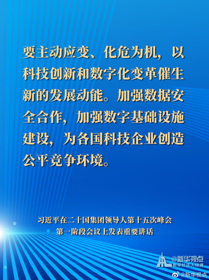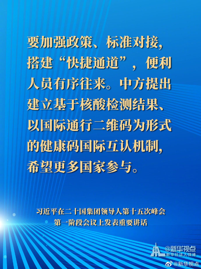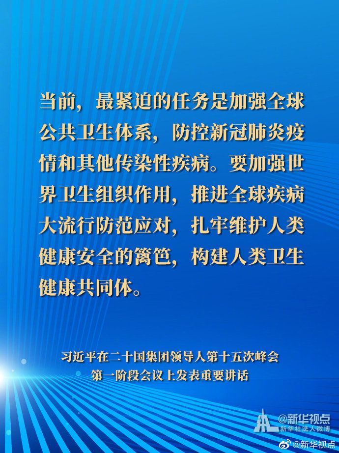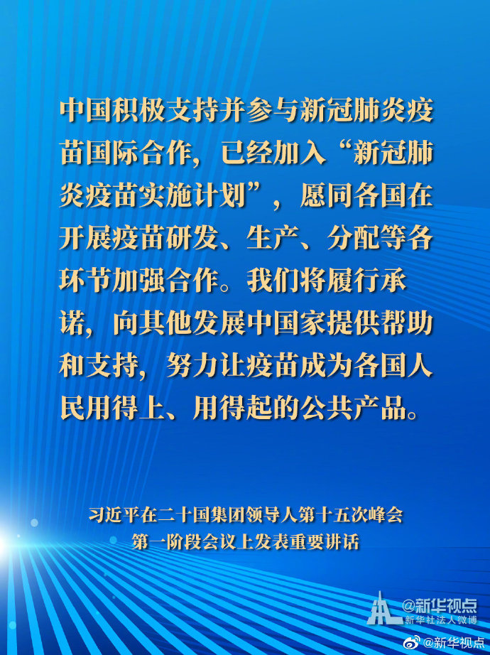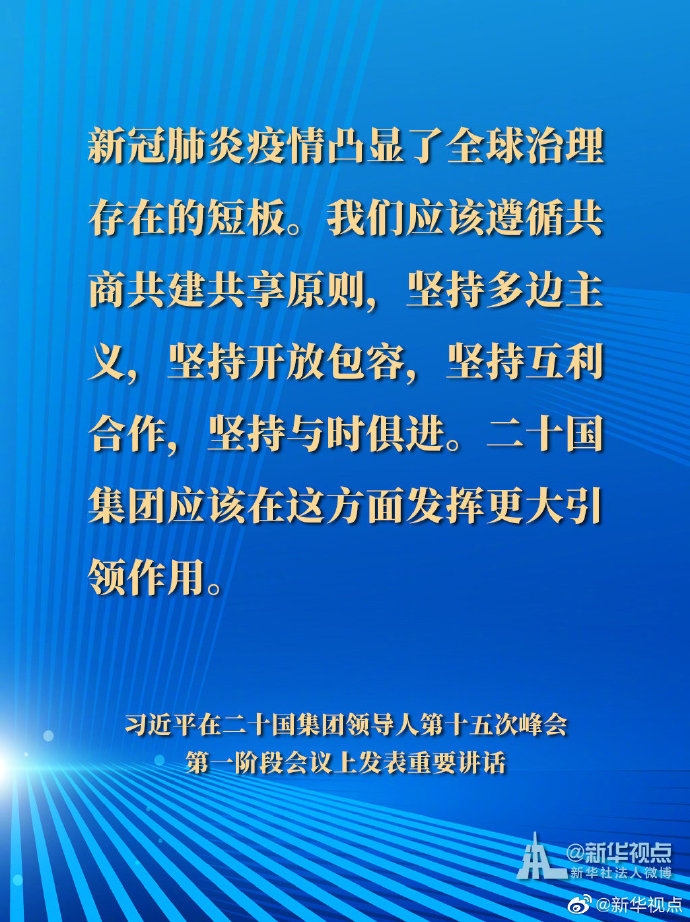 國家主席習近平21日晚在北京以視頻方式出席二十國集團領(lǐng)導(dǎo)人第十五次峰會第一階段會議并發(fā)表重要講話。以下是講話要點。