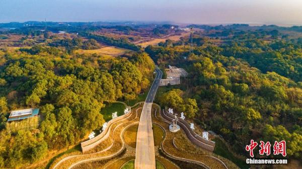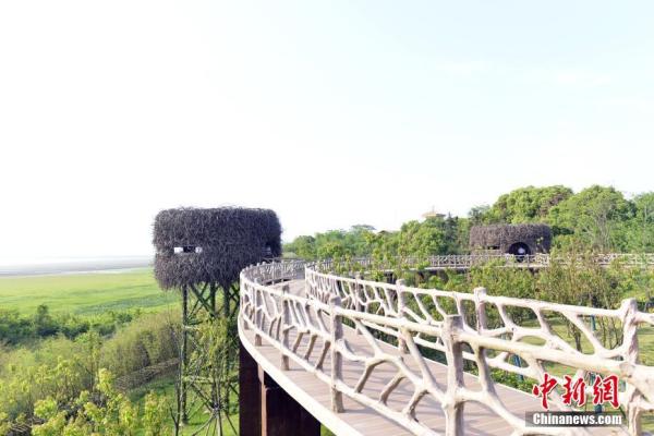 候鳥小鎮的觀鳥臺設計采用仿生學原理,建造了鳥巢、鳥蛋、梧桐樹等造型觀鳥點。建筑材料就地取材,利用舊磚、舊瓦等,減少環境破壞與污染。圖為永修縣吳城鎮候鳥小鎮觀鳥點。 江西九江永修縣委宣傳部供圖