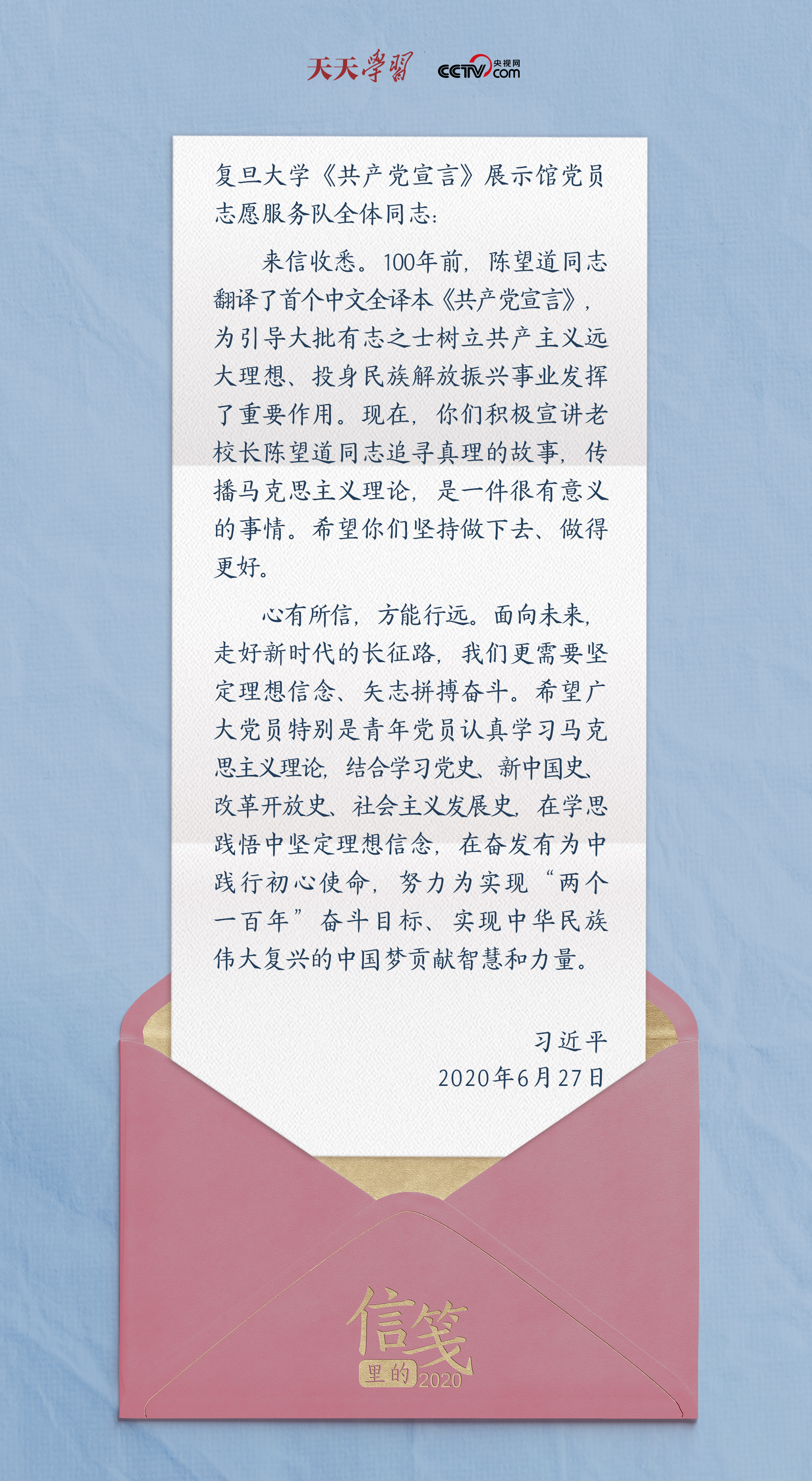 編者按:“云中誰寄錦書來”。在2020這極不平凡的一年里,習(xí)近平總書記多次以書信的方式同人民群眾、黨員干部以及各行各業(yè)各界人士交流互動。一封封信箋,傳達(dá)關(guān)切、鼓勵與厚望,筆筆見真情,句句暖人心。歲末之際,央視網(wǎng)《天天學(xué)習(xí)》欄目推出年終策劃“信箋里的2020”,為您講述總書記回信背后的故事。