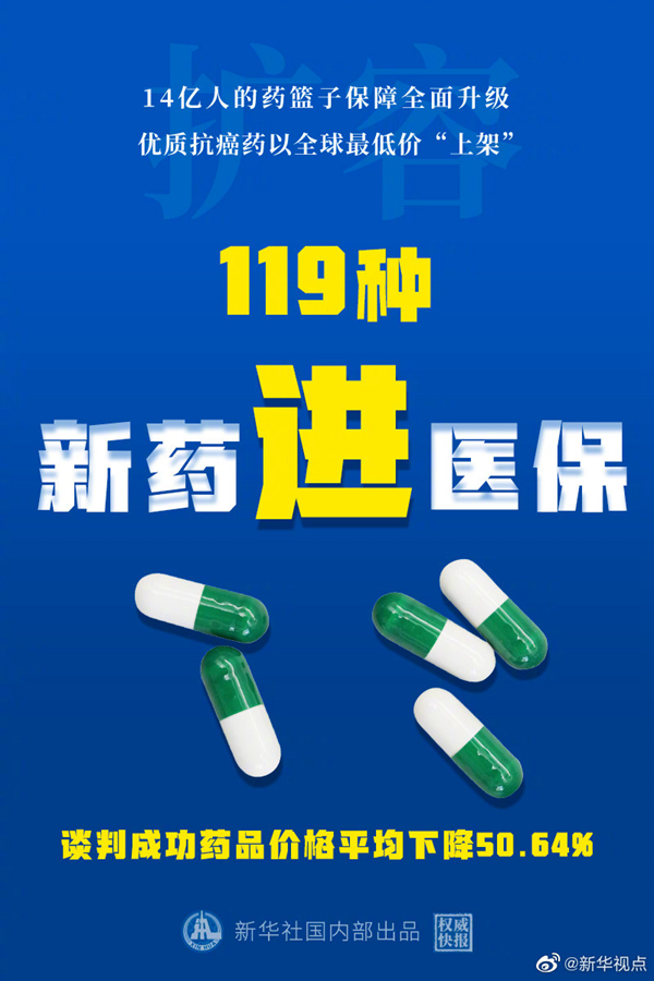 2020年國家醫(yī)保目錄調(diào)整結(jié)果28日出爐。119種新藥被納入醫(yī)保,談判成功的藥品價格平均下降50.64%。多個新上市抗癌藥以全球最低價“上架”。(記者:屈婷 海報設計:張晨光)