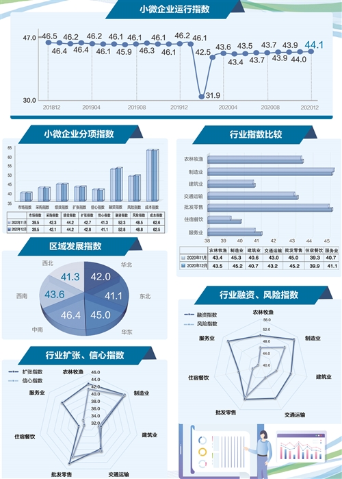 2020年12月份,“經(jīng)濟(jì)日?qǐng)?bào)—中國(guó)郵政儲(chǔ)蓄銀行小微企業(yè)運(yùn)行指數(shù)”為44.1,較上月上升0.1個(gè)點(diǎn)。