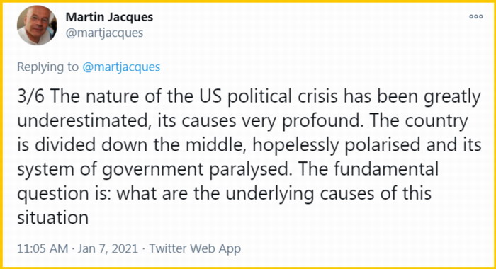 英國知名學者馬丁·雅克指出,國會事件反映出美國長期以來的分裂與衰落。美國政治亂象冰凍三尺,非一日之寒。這次危機由來已久,且遠未結(jié)束。