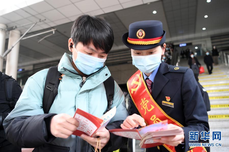 1月28日,重慶客運段工作人員在重慶北站向乘客發放安全宣傳手冊。