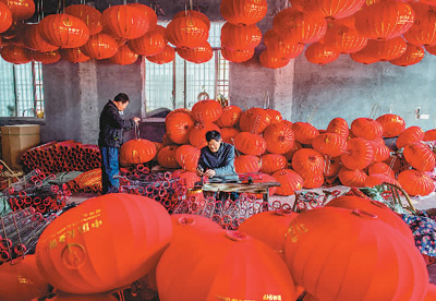近年來,浙江省臺州市仙居縣橫溪鎮依托燈籠制作傳統手工技藝,發展大紅燈籠加工產業,帶動村民在家門口就業增收。圖為日前橫溪鎮三棗園村農民正在趕制大紅燈籠。