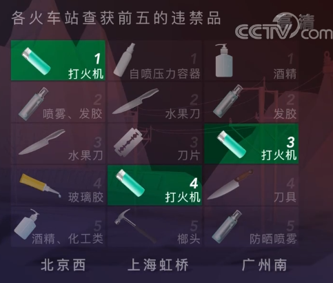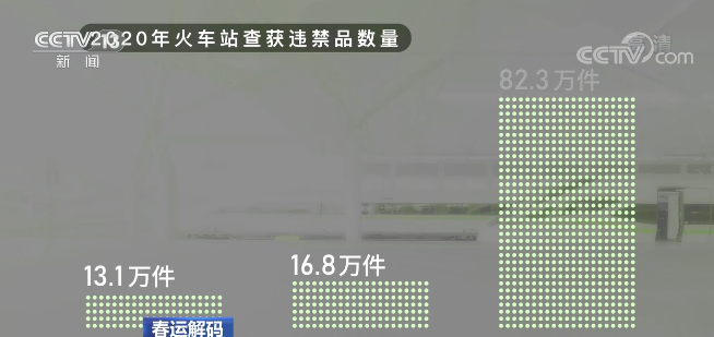這是分別從北京西站、上海虹橋站和廣州南站拿到的數據,在2020年,這三個火車站分別查獲數十萬件違禁品。