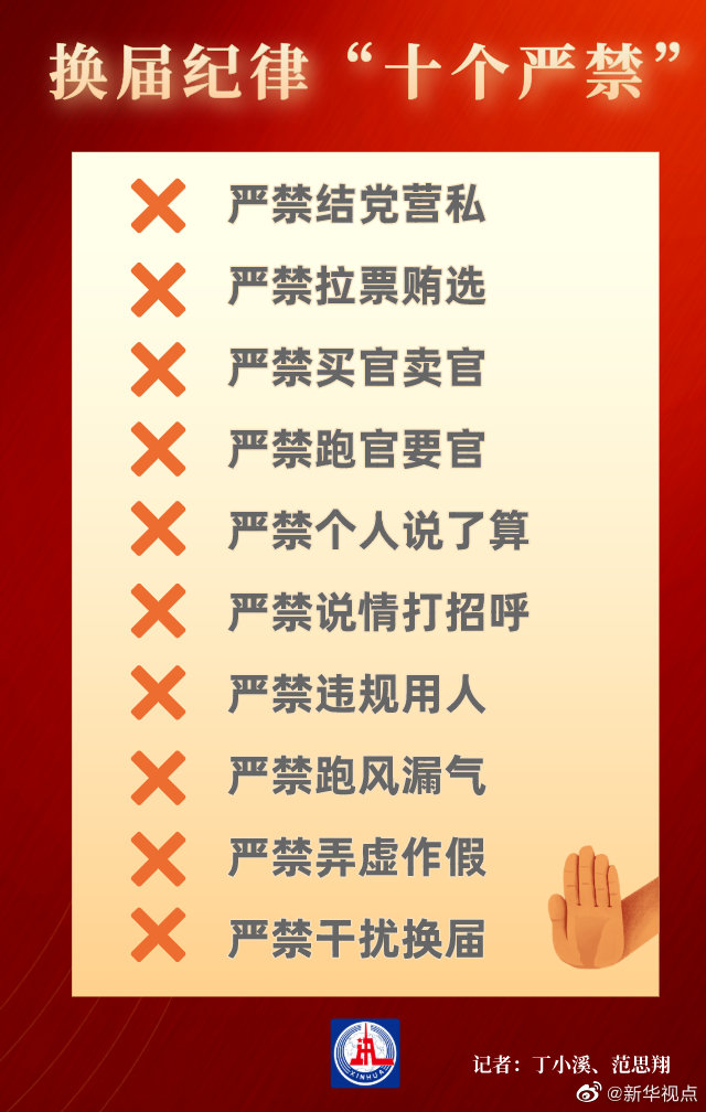 《通知》規(guī)定,要嚴(yán)明換屆紀(jì)律,堅(jiān)決維護(hù)換屆工作嚴(yán)肅性。一是嚴(yán)禁結(jié)黨營(yíng)私,對(duì)拉幫結(jié)派、上下勾聯(lián)、搞團(tuán)團(tuán)伙伙和小圈子的,以人劃線、任人唯親、排斥異己的,培植個(gè)人勢(shì)力、結(jié)成利益集團(tuán)的,一律給予黨紀(jì)政務(wù)處分。二是嚴(yán)禁拉票賄選,對(duì)通過(guò)宴請(qǐng)、安排消費(fèi)活動(dòng),快遞郵寄、電子紅包、網(wǎng)上轉(zhuǎn)賬等方式贈(zèng)送禮品禮金,以及打電話、發(fā)信息、當(dāng)面拜訪、委托他人出面等形式,在民主推薦和選舉中搞拉票、串聯(lián)、助選等非組織活動(dòng)的,一律排除出人選名單或者取消候選人資格,并視情節(jié)輕重給予黨紀(jì)政務(wù)處分,賄選的依法處理。三是嚴(yán)禁買官賣官,對(duì)以謀取職務(wù)、提高職級(jí)待遇等為目的賄賂他人的,通過(guò)幫助他人謀取職務(wù)、提高職級(jí)待遇索取、收受賄賂的,一律先停職或者免職,并依規(guī)依紀(jì)依法處理。四是嚴(yán)禁跑官要官,對(duì)采取拉關(guān)系或者要挾等手段謀取職務(wù)、提高職級(jí)待遇的,一律不得提拔或者進(jìn)一步使用,并視情節(jié)輕重給予批評(píng)教育、組織處理或者黨紀(jì)政務(wù)處分。五是嚴(yán)禁個(gè)人說(shuō)了算,對(duì)以個(gè)人決定代替黨組織集體研究決定的,授意、暗示、指定提拔調(diào)整人選的,一律取消相關(guān)任用決定,并嚴(yán)肅追究相關(guān)領(lǐng)導(dǎo)和有關(guān)人員責(zé)任。六是嚴(yán)禁說(shuō)情打招呼,對(duì)為他人推薦提名、提拔調(diào)整疏通關(guān)系的,違規(guī)干預(yù)下級(jí)或者原任職地區(qū)和單位干部選拔任用的,一律作為領(lǐng)導(dǎo)干部違規(guī)插手干預(yù)重大事項(xiàng)的情形記錄在案,并視情節(jié)輕重給予批評(píng)教育、組織處理或者黨紀(jì)政務(wù)處分。七是嚴(yán)禁違規(guī)用人,對(duì)借換屆之機(jī)突擊提拔調(diào)整干部、超職數(shù)配備干部、違反規(guī)定程序選拔任用干部的,一律宣布無(wú)效,并對(duì)相關(guān)人員依規(guī)依紀(jì)進(jìn)行處理。八是嚴(yán)禁跑風(fēng)漏氣,對(duì)泄露、擴(kuò)散換屆人事安排等保密信息的,一律追究相關(guān)人員責(zé)任。九是嚴(yán)禁弄虛作假,對(duì)篡改、偽造干部人事檔案材料的,在換屆考察工作中隱瞞或者歪曲事實(shí)真相的,一律予以糾正,并視情節(jié)輕重對(duì)相關(guān)人員給予組織處理或者黨紀(jì)政務(wù)處分。十是嚴(yán)禁干擾換屆,對(duì)境內(nèi)外敵對(duì)勢(shì)力攪擾破壞換屆的,嚴(yán)加防范、堅(jiān)決打擊;對(duì)黑惡勢(shì)力、家族勢(shì)力、宗教勢(shì)力干擾影響換屆選舉的,違規(guī)接受境外機(jī)構(gòu)、組織、個(gè)人提供資助或者培訓(xùn)的,以威脅、欺騙、利誘等手段妨害他人自由行使選舉權(quán)的,造謠誹謗、誣告陷害或者打擊報(bào)復(fù)他人的,一律嚴(yán)厲查處,涉嫌違法犯罪的依法追究法律責(zé)任。