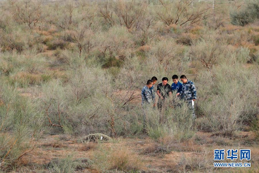 空軍某運輸搜救團一大隊官兵和地方林業人員在內蒙古阿拉善左旗“1992年播區”察看植物生長情況(2020年6月8日攝)。新華社發(劉暢 攝)