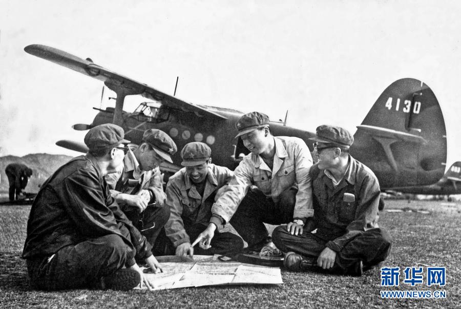 1983年4月,第一代“飛播人”、時任空軍某團一大隊大隊長宋占清(右二)率領一大隊多個機組進駐陜西漢中執行飛播造林任務(資料照片)。新華社發