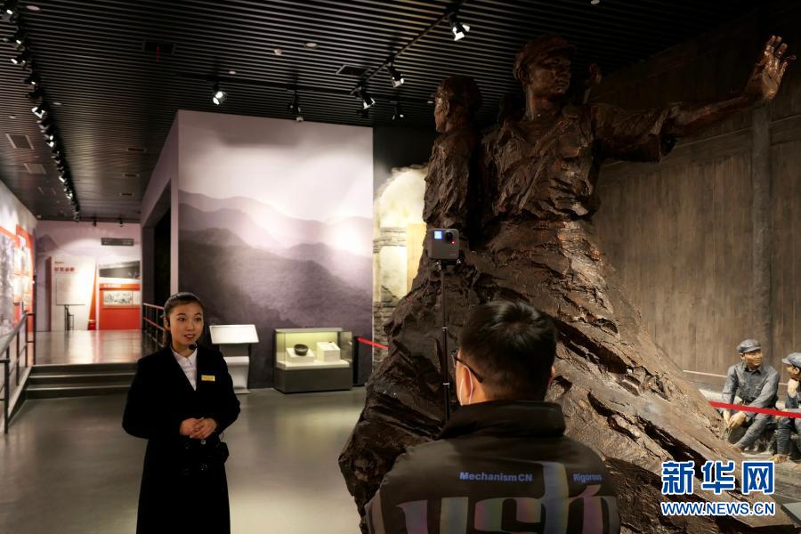 1月26日,在中國工農紅軍第二方面軍長征出發地紀念館,講解員(左)在介紹一尊雕像,雕像中的三位紅軍都是獨臂,紅二方面軍出了三位“獨臂開國將軍”——賀炳炎、余秋里、晏福生。新華社記者 蘇曉洲 攝