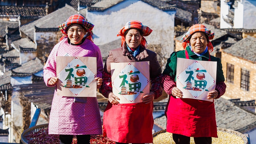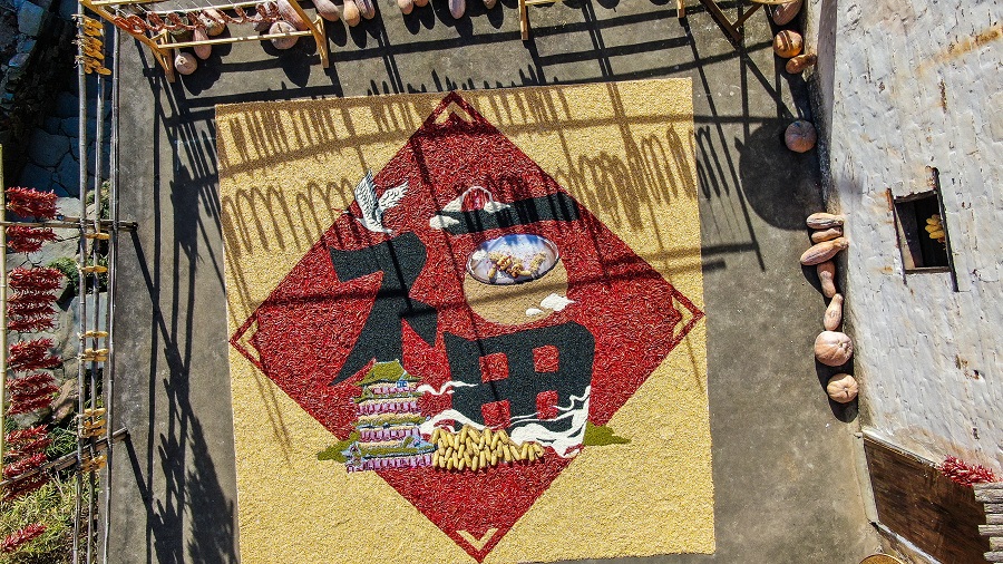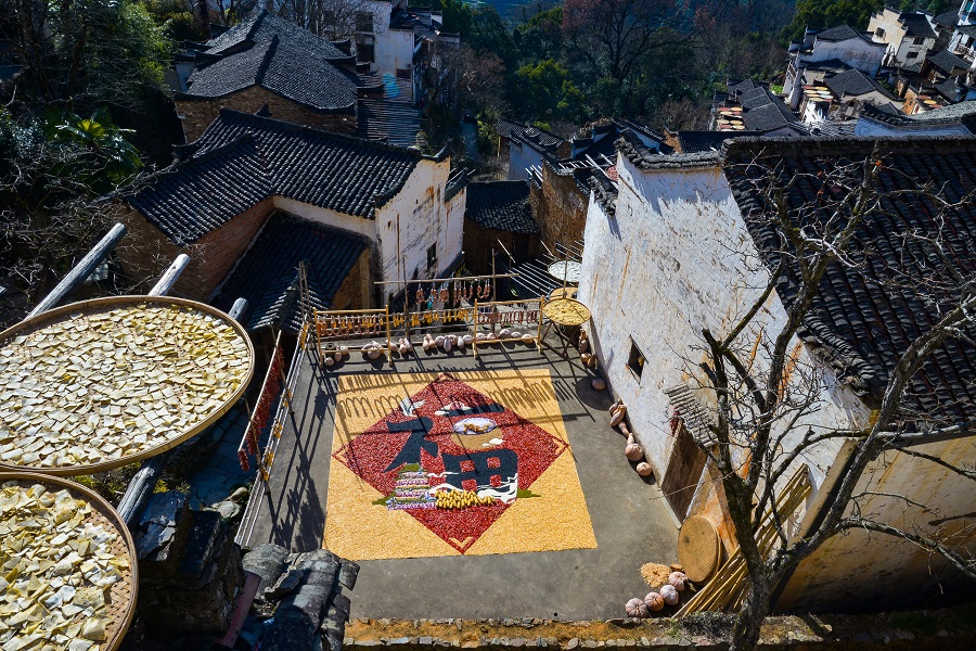春節(jié)臨近,江西省婺源縣篁嶺村,年味越來越濃。近日,曬秋大媽們用辣椒、玉米等農(nóng)作物曬出“!弊衷煨停瑸橛慰退蜕闲履甑淖8!_@個“!弊诌融入了瓦罐湯、滕王閣等江西元素,十分富有創(chuàng)意。(王中慶)