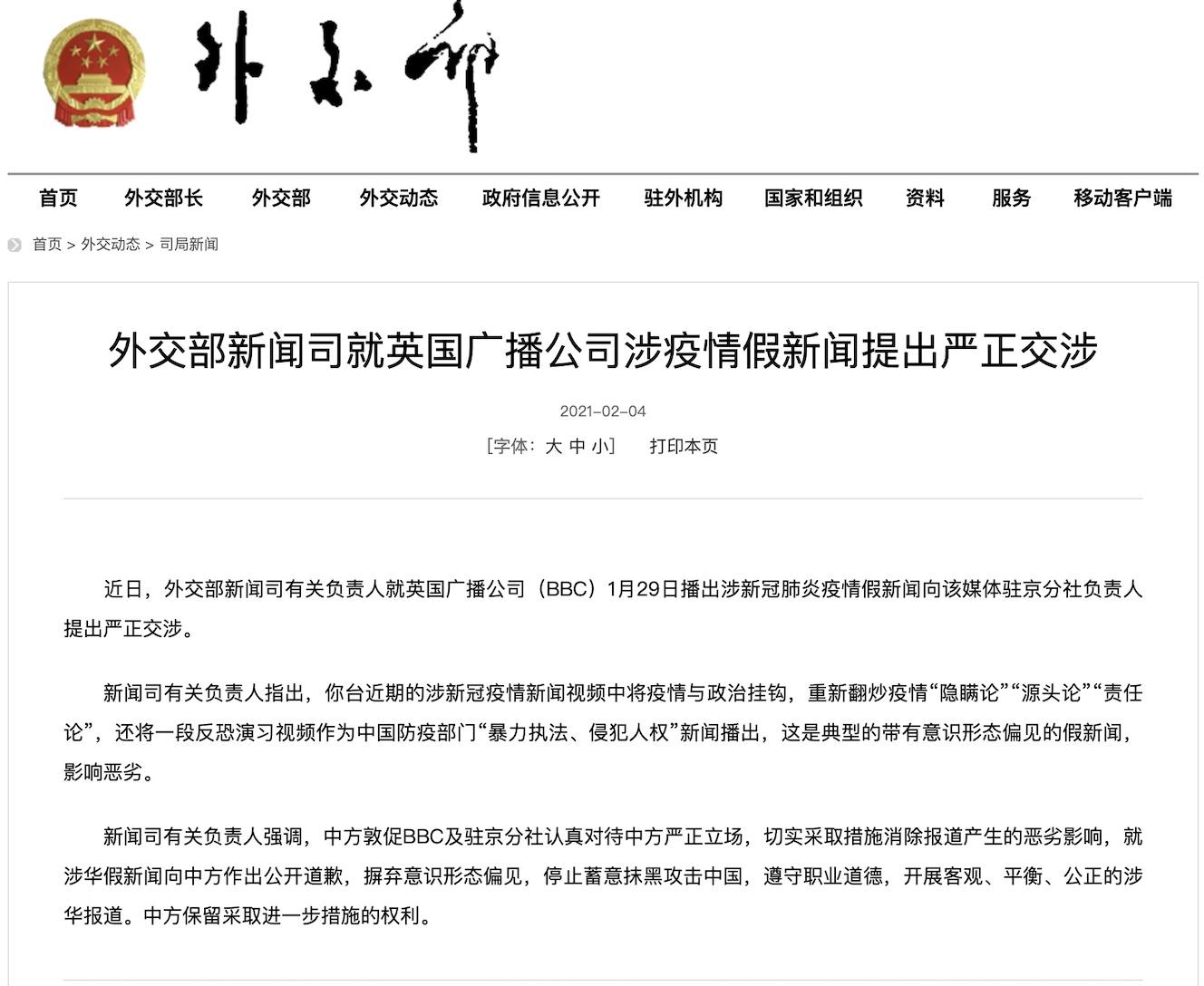2月4日,外交部新聞司發布聲明,就BBC涉疫情假新聞提出嚴正交涉,敦促BBC就涉華假新聞向中方作出公開道歉。