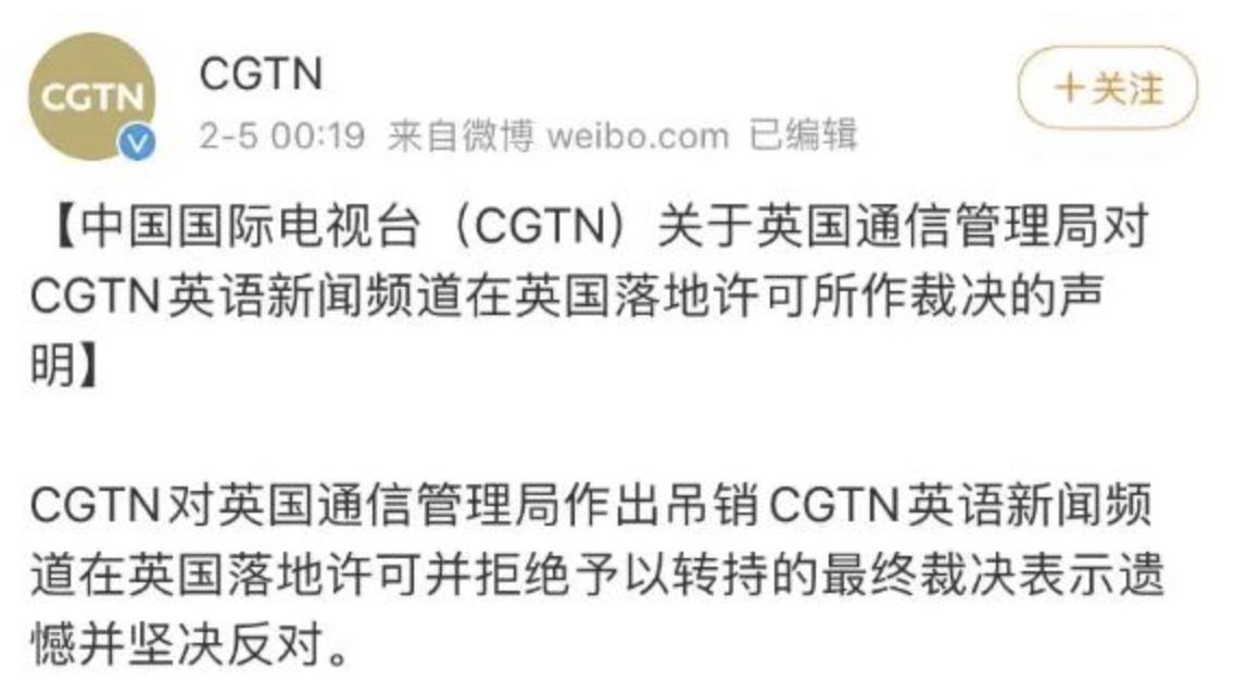 圖丨英國通信管理局吊銷CGTN在英落地許可的聲明和CGTN的回應聲明