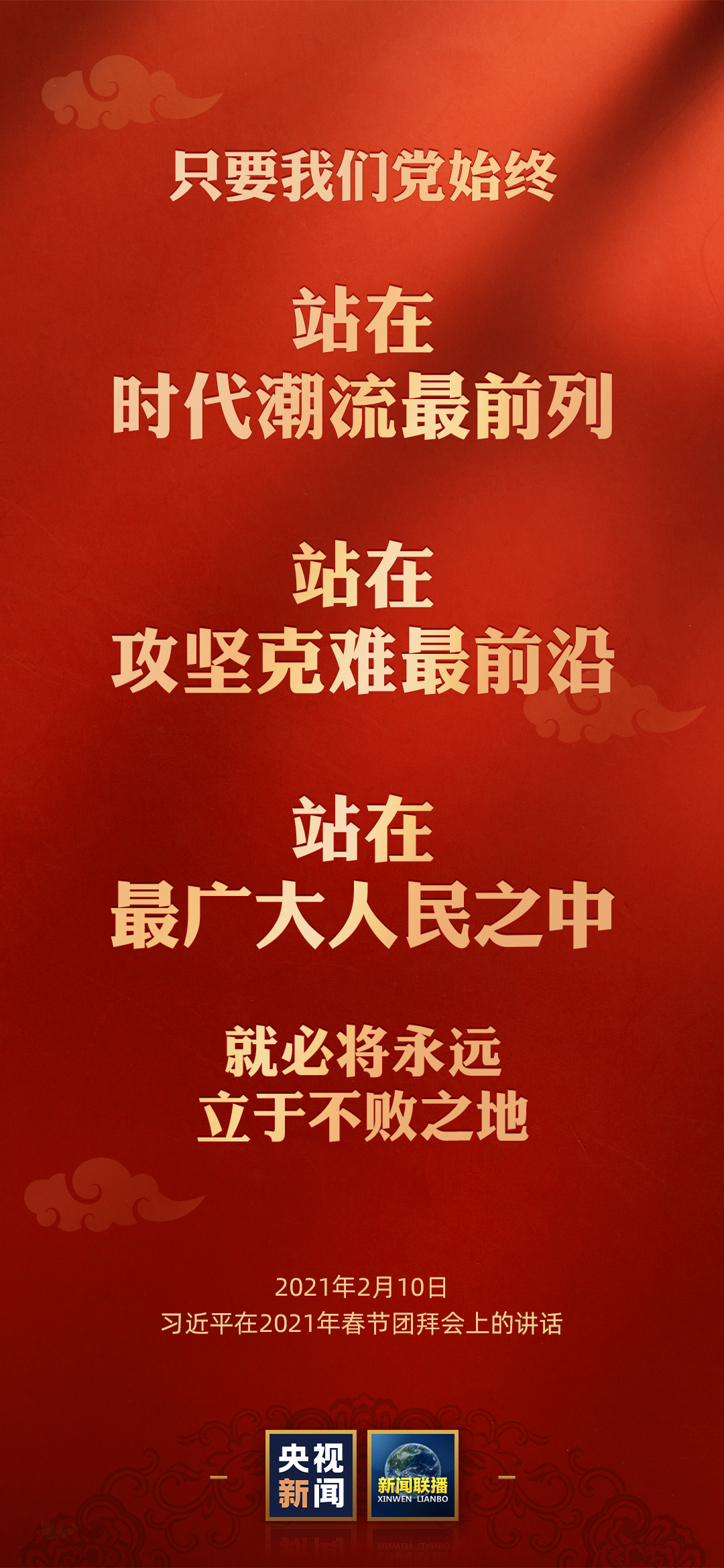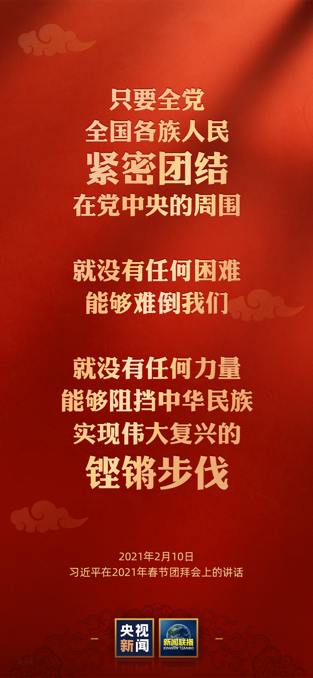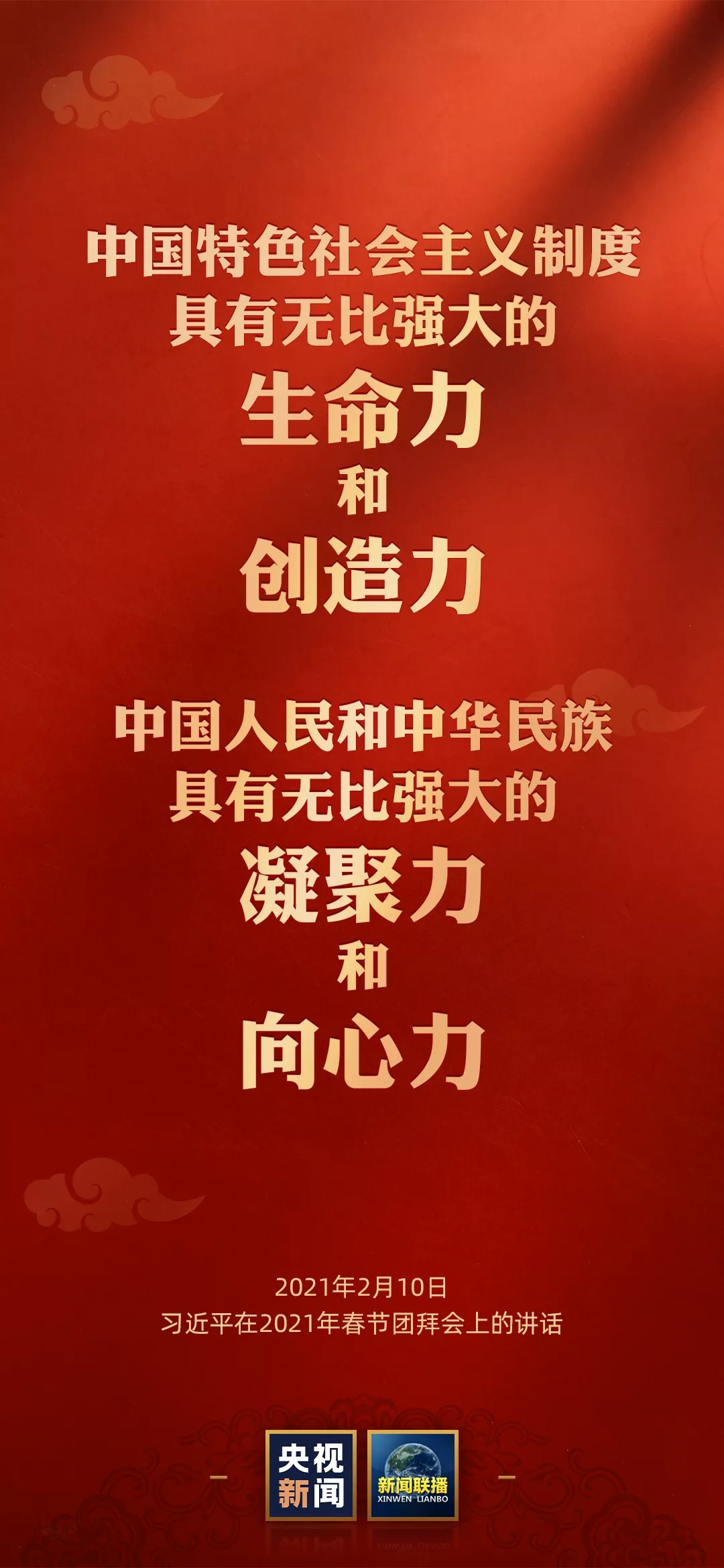 中共中央、國務(wù)院10日上午在人民大會堂舉行2021年春節(jié)團拜會。中共中央總書記、國家主席、中央軍委主席習(xí)近平發(fā)表講話,代表黨中央、國務(wù)院,向全國各族人民,向香港特別行政區(qū)同胞、澳門特別行政區(qū)同胞、臺灣同胞和海外僑胞拜年↓